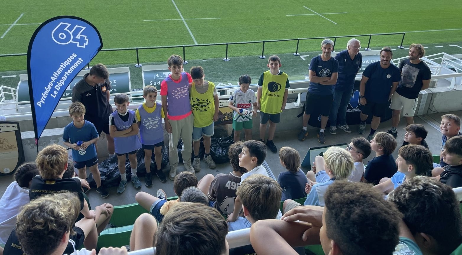 À l’heure des récompenses de la deuxième édition du Trophée des sections sportives rugby au stade du Hameau à Pau, Daniel Pédaillé, président du CD 64 et Evelyne Peyrou, vice-présidente, ont remis 30 chasubles Optic2000 et six gourdes aux représentants des six collèges présents.