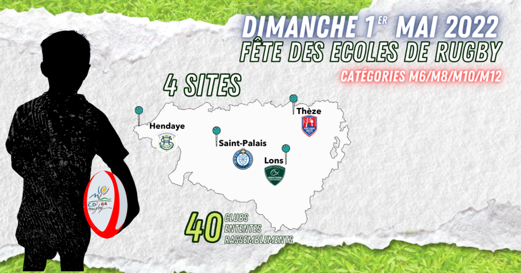 A partir de 10h, les 40 clubs - ententes - rassemblements se retrouvent sur quatre sites Hendaye, Lons, Saint-Palais, Thèze avec 10 écoles de rugby par site et 4 catégories M6-M8-M10-M12
