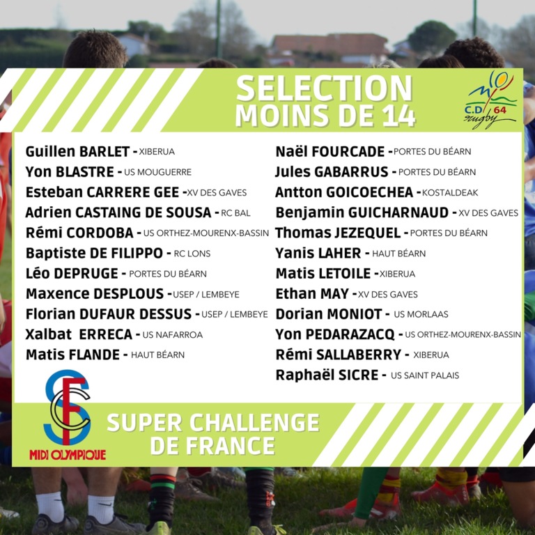 SÉLECTION.- Voici la sélection des joueurs de Moins de 14 ans du Comité Départemental des Pyrénées-Atlantiques qui disputera à Bayonne l'étape 3 du Super Challenge de France, Tournoi Patrice-Cazauran.